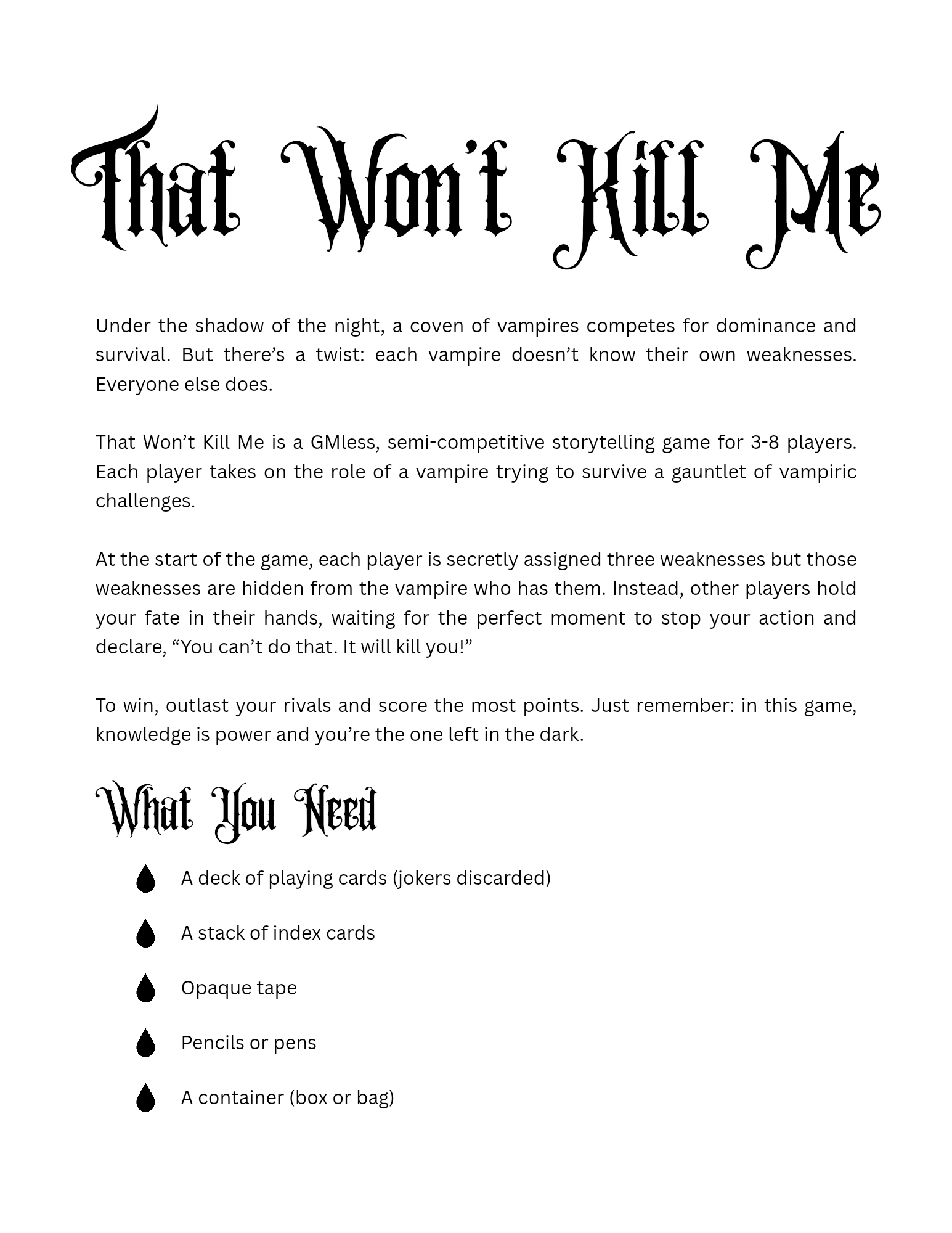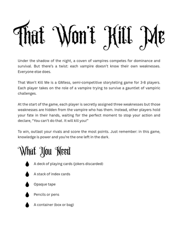 That Won't Kill Me is a GMless, semi-competitive storytelling game for 3-8 players.